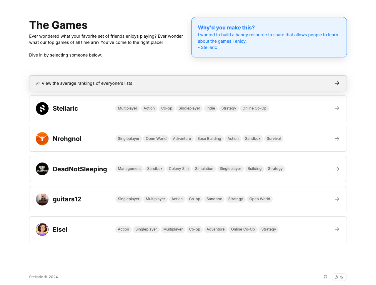 A website I designed and built for my friends and I to share rankings of our favorite and least favorite video games. You can visit it here. You can browse the GitHub repo here.