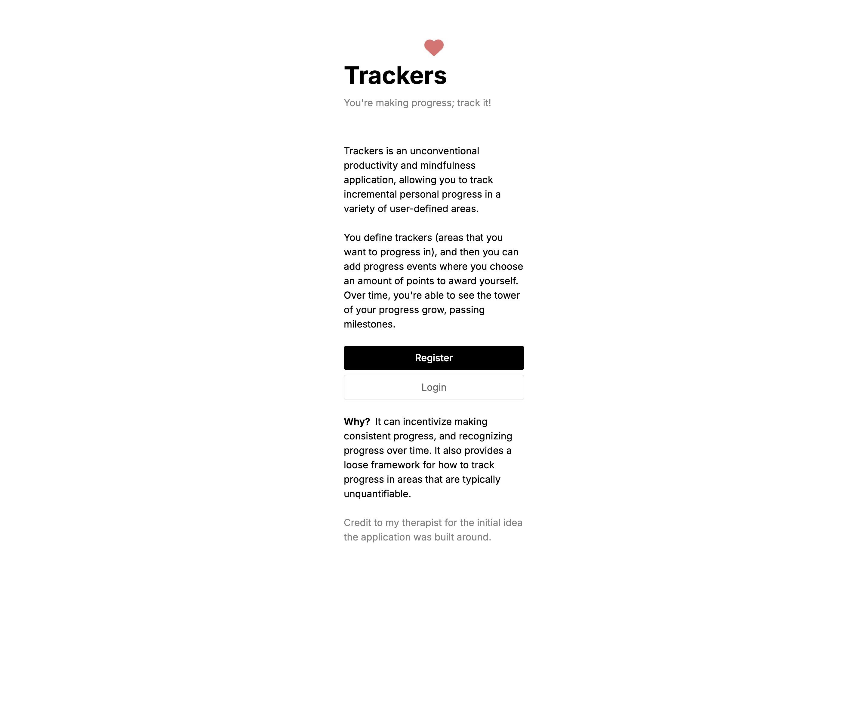 A website I designed and built to encourage mindfully recognizing personal progress within user-defined areas. While registration is restricted, you can visit it here. You can browse the GitHub repo here.